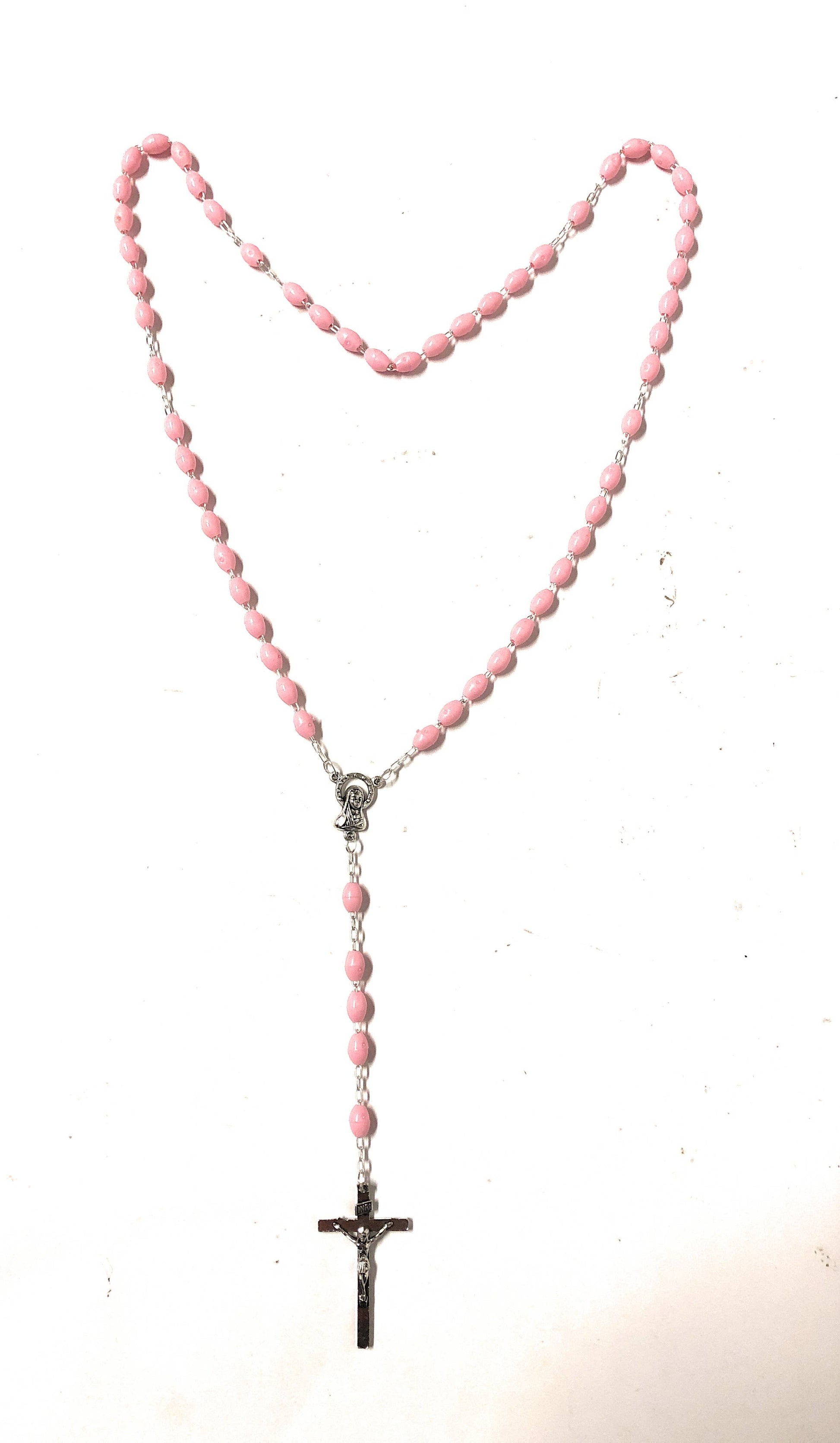 Chapelet en résine sur une chaîne avec des perles roses de 8X6 mm.