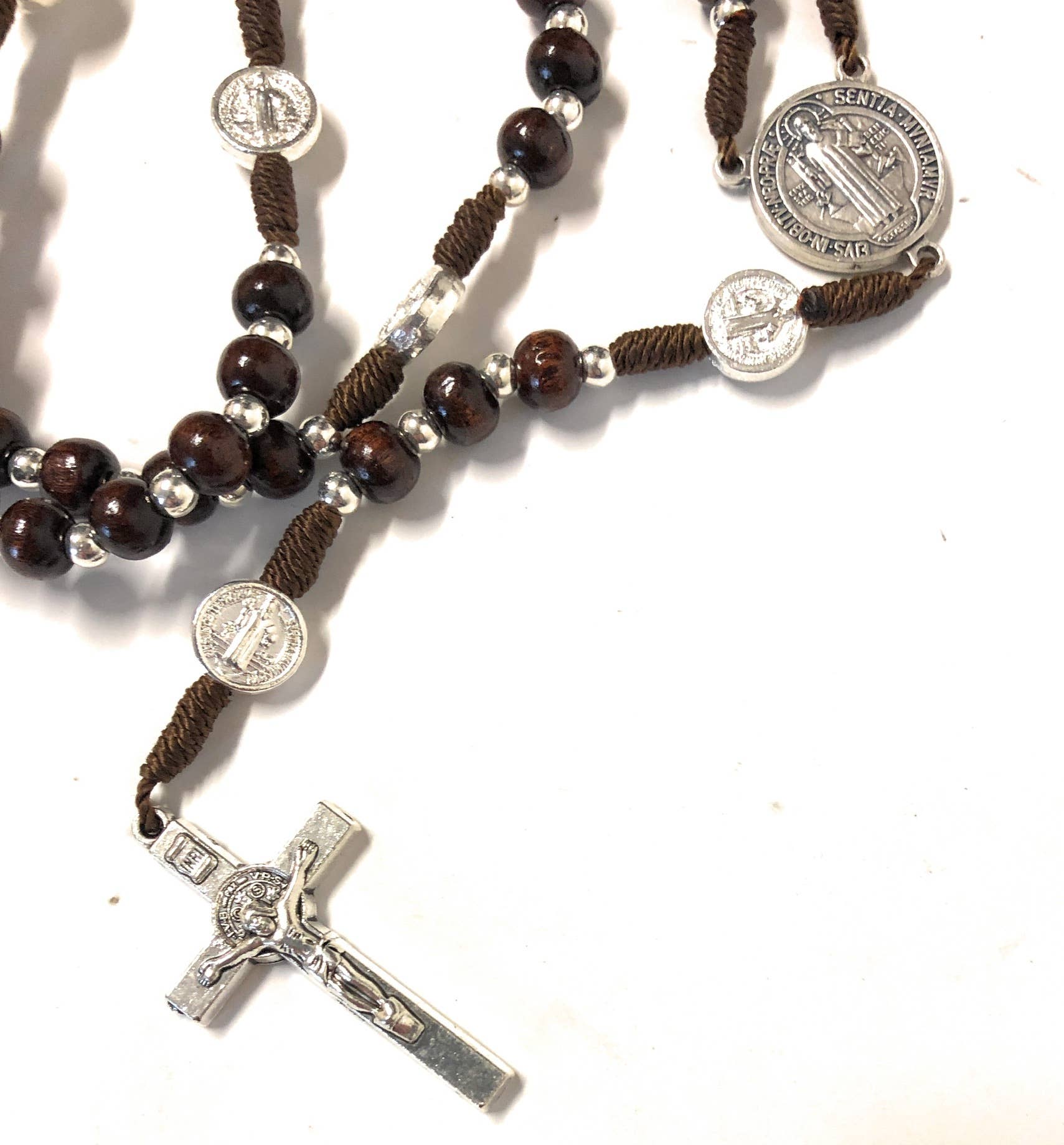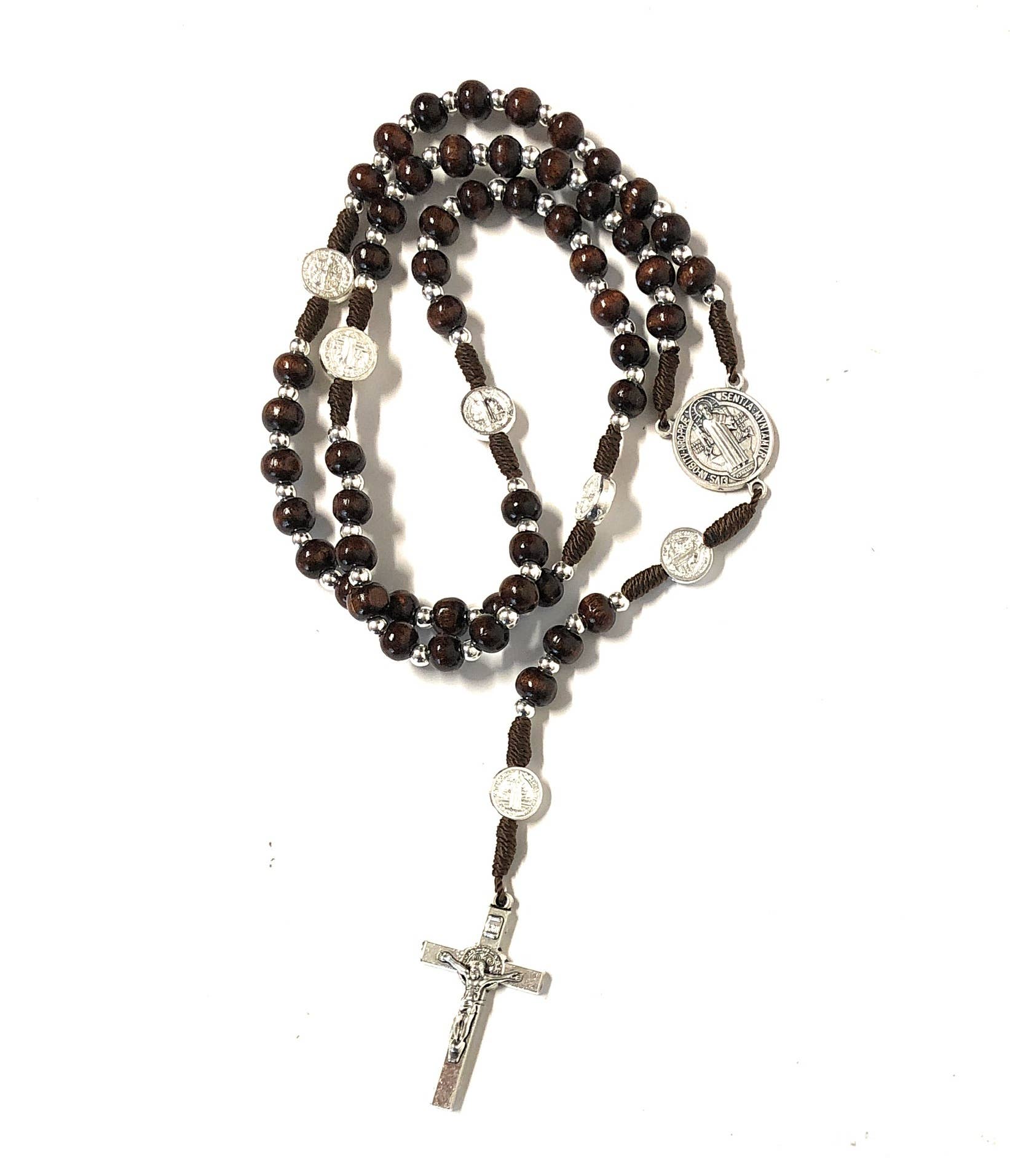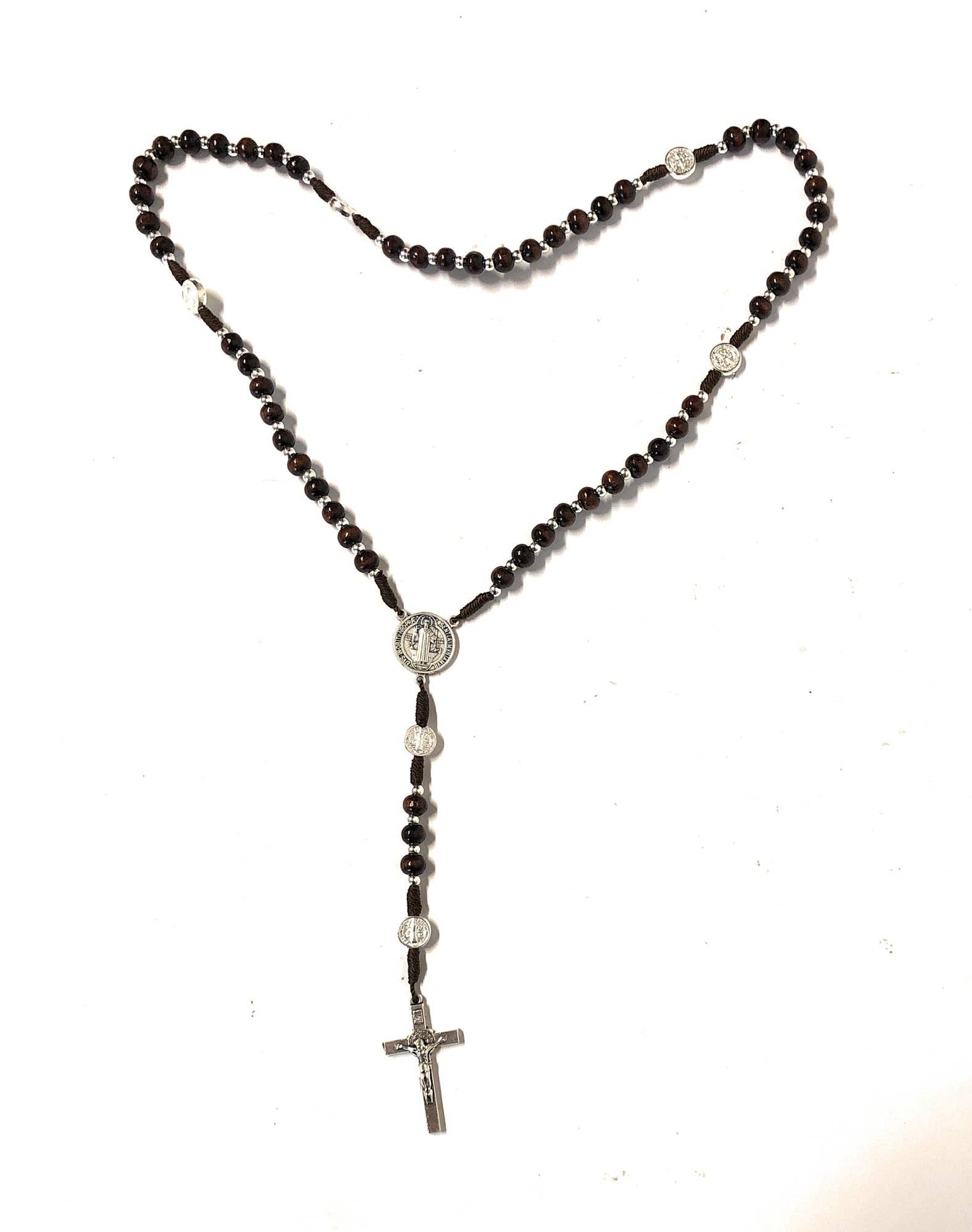 Chapelet en bois de palissandre relié en corde avec des perles de 6 mm et des médailles de Saint-Benoît argentées. Au centre se trouve une médaille de Saint Benoît. Entièrement relié à la main en Italie. Longueur totale 43 cm