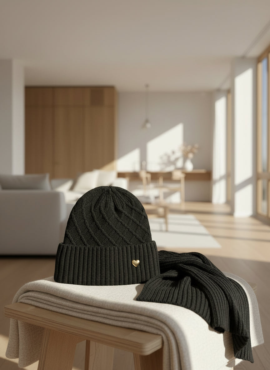 Ensemble bonnet et écharpe alliant confort et élégance intemporelle. Ce duo harmonieux se distingue par un délicat cœur doré qui ajoute une touche de raffinement à votre silhouette hivernale. Parfait pour les journées froides, cet accessoire combine chaleur et style, offrant une protection optimale tout en exprimant votre personnalité. Un choix judicieux pour compléter votre garde-robe de saison avec distinction.